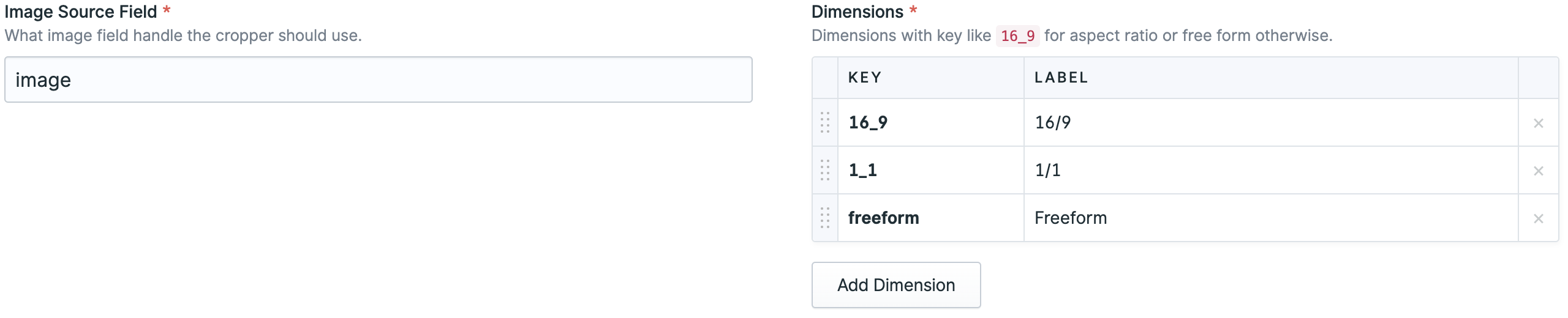 handle: crops field: type: image_cropper display: Crops show_details: true source: image dimensions: '16_9': 16/9 '1_1': 1/1 freeform: Freeform