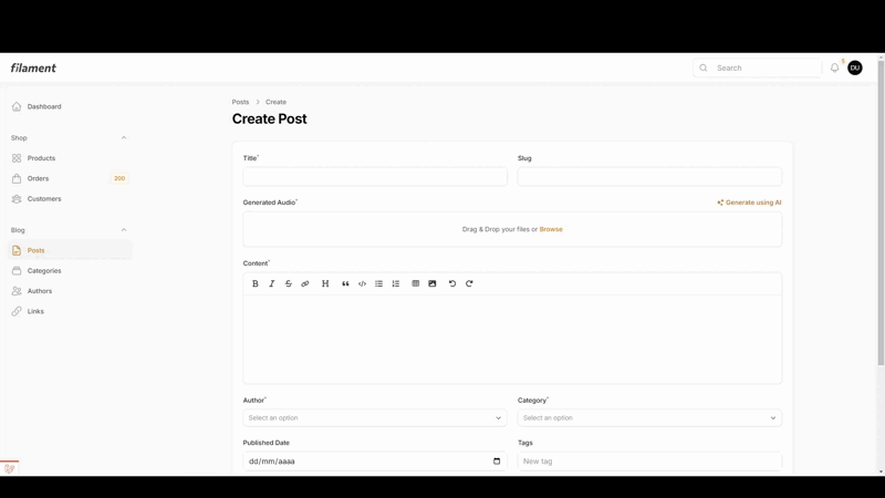 This custom field allows you to generate audios with different languages and voices using free AI voice generator. It extends the FileUpload field and adds a button to open the audio generator modal where you can generate the audio file.